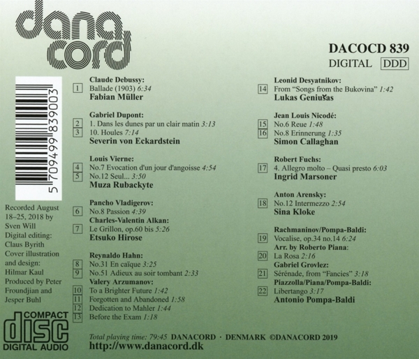 01. Müller, Fabian "Ballade" La maison dans les dunes (Auszug) 02. Eckardstein, Severin van "1. Dans les dunes par un clair matin" 03. Eckardstein, Severin van "10. Houles" Pr?ludien op. 36 Nr. 1-12 (Auszug) 04. Rubackyte, Muza "Nr. 7 Evocation d'un jour d'angoisse" 05. Rubackyte, Muza "Nr. 12 Seul..." Impressionen op. 9 Nr. 1-10 06. Hirose, Etsuko "Nr. 8 Passion" 07. Hirose, Etsuko "Nocturne Nr. 4 op. 60 "Le Grillon"" Le Rossignol ?perdu (Auszug) 08. Geniusas, Lukas "Nr. 31 En ca?que" 09. Geniusas, Lukas "Nr. 51 Adieux au soir tombant" Stücke für Klavier op. 74 Nr. 1-27 10. Geniusas, Lukas "To a brighter future" 11. Geniusas, Lukas "Forgotten and abandoned" 12. Geniusas, Lukas "Dedication to Mahler" 13. Geniusas, Lukas "Before the exam" 14. Geniusas, Lukas "Songs from the Bukovina (Auszug)" Ein Liebesleben op. 22 (Auszug) 15. Callaghan, Simon "Nr. 6 Reue" 16. Callaghan, Simon "Nr. 8 Erinnerung" Sonate Nr. 1 Ges-Dur op. 19 (Auszug) 17. Marsoner, Ingrid "4. Allegro molto - Quasi presto" Charakterstücke op. 36 Nr. 1-24 (Auszug) 18. Kloke, Sina "Nr. 12 Intermezzo" 19. Pompa-Baldi, Antonio "Vocalise op. 34 Nr. 14" 20. Pompa-Baldi, Antonio "La Rosa" Fancies (Auszug) 21. Pompa-Baldi, Antonio "Serenade" 22. Pompa-Baldi, Antonio "Libertango"