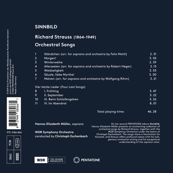 Beschreibung:On her second PENTATONE album Sinnbild, soprano Hanna-Elisabeth Müller presents an enchanting collection of orchestral songs by Richard Strauss, together with the WDR Symphony Orchestra under the baton of Christoph Eschenbach. Culminating in the famous Four Last Songs, the program explores all forms of farewell - the big and the small - that we go through as human beings. Amidst this melancholia, Strauss's lush, glorious orchestral writing and his exceptional understanding of the soprano voice offer profound solace to the listener. Hanna-Elisabeth Müller is among the most celebrated lyrical sopranos of our times. Sinnbild is the second album as part of her exclusive collaboration with PENTATONE. The WDR Symphony Orchestra has released several albums with the label, including Beethoven's complete symphonies (2020) and Hindemith orchestral works (2018), both with Marek Janowski, as well as the Strauss album Aber der richtige... (2018) with Arabella Steinbacher and Lawrence Foster. Christoph Eschenbach is universally acclaimed as conductor and pianist, and makes his PENTATONE debut., Runningtime: 00:00:00, Labelcode PNTA5186806.2