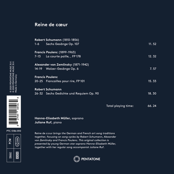 Beschreibung:On her PENTATONE debut Reine de coeur, star soprano Hanna-Elisabeth Müller brings the German and French art song traditions together, focusing on song cycles by Robert Schumann, Alexander von Zemlinsky and Francis Poulenc, accompanied by pianist Juliane Ruf. The album presents a highly personal anthology of songs that address love and loss, and the heights and depths of the human soul. While Schumann's Sechs Gesänge Op. 107 and Sechs Gedichte und Requiem Op. 90 offer the quintessence of the Romantic German Lied, Zemlinsky's turn-of-the-century Walzer-Gesänge introduce the listener to a later and less well-known chapter in the genre's history. Poulenc's La courte paille and Fiançailles pour rire provide an atmospheric, at times humoristic complement to the Weltschmerz of the German songs. Hanna-Elisabeth Müller is among the most celebrated young sopranos of our times. Reine de coeur is the first album of her exclusive collaboration with PENTATONE. She works together with her regular accompanist, pianist Juliane Ruf., Runningtime: 00:00:00, Labelcode PNTA5186810.2