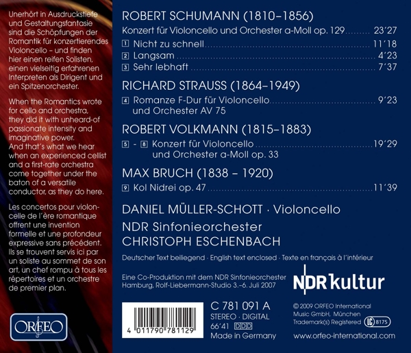 | Beschreibung: | Runningtime: 00:00:00, Cello: Daniel Müller-Schott, Conductor: Christoph Eschenbach, Orchestra: NDR Sinfonieorchester, Composed By: Robert Schumann, Composed By: Richard Strauss, Composed By: Robert Volkmann, Composed By: Max Bruch, Labelcode OEO781091.2 (C 781 091 A), Recorded At Rolf Liebermann Studio |