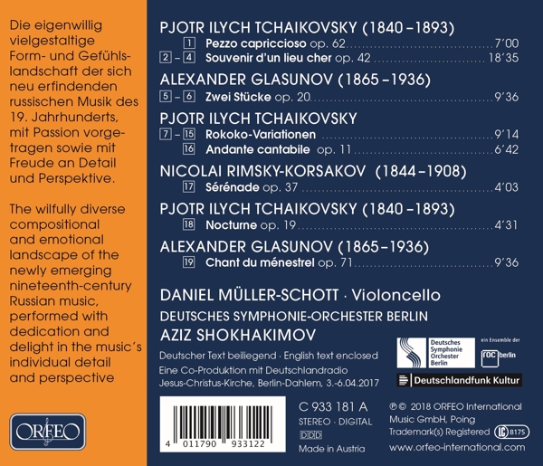 Beschreibung:This new release features the willfully diverse compositional and emotional landscape of newly discovered and rediscovered nineteenth-century Russian music, performed with dedication and delight in the music's individual detail and perspective. Daniel Muller-Schott ranks among the world's best cellist and can be heard on all of the foremost international concert stages. "A fearless player with technique to burn" (New York Times), he has made his mark by delighting audiences for two decades. Muller-Schott works with leading international orchestras: in the US with the orchestras in New York, Boston, Cleveland, Chicago, Philadelphia, San Francisco and Los Angeles, in Europe with the Berlin Philharmonic, the Leipzig Gewandhaus Orchestra, the Radio Orchestras of Berlin, Munich, Frankfurt, Stuttgart, Leipzig, Hamburg, Copenhagen and Paris, the London Symphony, and more. In the present recording, he plays the "Ex Shapiro" Matteo Goffriller cello, made in Venice in 1727, and a bow made by FX Tourte of Paris in c. 1820., Runningtime: 00:00:00, Labelcode OEO933181.2