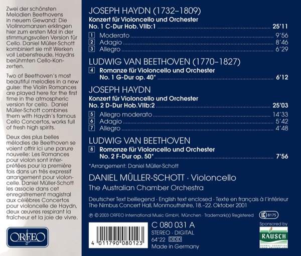 1.1 Cello Concerto No. 1 in C Major, H. 7B/1: Moderato1.2 Cello Concerto No. 1 in C Major, H. 7B/1: Adagio1.3 Cello Concerto No. 1 in C Major, H. 7B/1: Allegro1.4 Romance for Violin ; Orchestra No. 1 in G Major, Op. 401.5 Cello Concerto No. 2 in D Major, H. 7B/2 (Op. 101): Allegro Moderato1.6 Cello Concerto No. 2 in D Major, H. 7B/2 (Op. 101): Adagio1.7 Cello Concerto No. 2 in D Major, H. 7B/2 (Op. 101): Allegro1.8 Romance for Violin ; Orchestra No. 2 in F Major, Op. 50 |