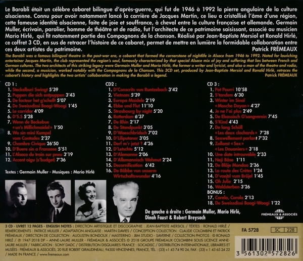 Disc 03 01. Ensemble "Pot pourri" 02. Dinah Faust "S'tandem" 03. Muller, Germain "Winter im sinai ® mosche dayan ¯" 04. Dinah Faust "Je ne l'ai plus" 05. Ensemble "De elsassisch g'sangverein" 06. Dinah Faust "S'kind" 07. Robert Breysach, Ren? Wieber "De lang schull ® les deux clochards ¯" 08. Muller, Germain "Sexwellement parlant" 09. Robert Breysach, Andr? Flick, Charles Falk "Zollamt ® sex ¯ ® les douaniers ¯" 10. Germain Muller, Robert Breysach, Ren? Wieber, Henri Meyer "Une date introuvable" 11. Ensemble "Neji base" 12. Ensemble "De bloje mondaa" 13. Ensemble "La route des cr?tes" 14. Dinah Faust, Michel Pierrat "D'voejel vum brojel" 15. Christian Hahn "Oh julie" 16. Dinah Faust "Waldsterben" 17. Muller, Germain "Carela, carola" 18. Muller, Germain "De sweissdissi boogie-woogie"