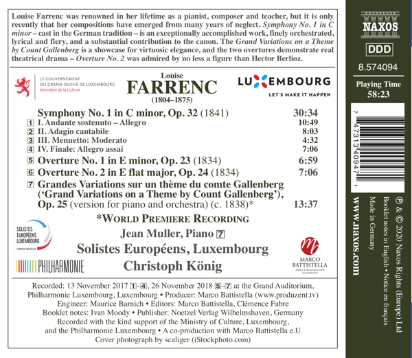 Beschreibung:Louise Farrenc was renowned in her lifetime as a pianist, composer and teacher, but it is only recently that her compositions have emerged from many years of neglect, Symphony No. 1 in C minor- cast in the German tradition- is an exceptionally accomplished work, finely orchestrated, lyrical and fiery, and a substantial contribution to the canon. The Grand Variations on a Theme by Count Gallenberg is a showcase for virtuosic elegance, and the two overtures demonstrate real theatrical drama- Overture No. 2 was admired by no less a figure than Hector Berlioz., Runningtime: 00:00:00, Co-producer [A Co-production With]: Marco Battistella, Composed By: Louise Farrenc, Conductor: Christoph König (2), Edited By [Editors]: Clemence Fabre, Edited By [Editors]: Marco Battistella, Engineer: Maurice Barnich, Liner Notes [Booklet Notes]: Ivan Moody, Liner Notes [Traduction Française]: David Ylla-Somers, Orchestra: Solistes Européens Luxembourg, Photography By: Christian Wind, Photography By: Francis Zuidberg, Photography By: Kaupo Kikkas, Photography By [Cover Photograph By]: Scaliger, Producer: Marco Battistella, Piano: Jean Muller (2), Labelcode NXS8574094.2 (8.574094), Phonographic Copyright (p) Naxos Rights Europe Ltd, Copyright (c) Naxos Rights Europe Ltd, Published By Florian Noetzel Verlag, Recorded At Philharmonie Luxembourg, Glass Mastered At Arvato