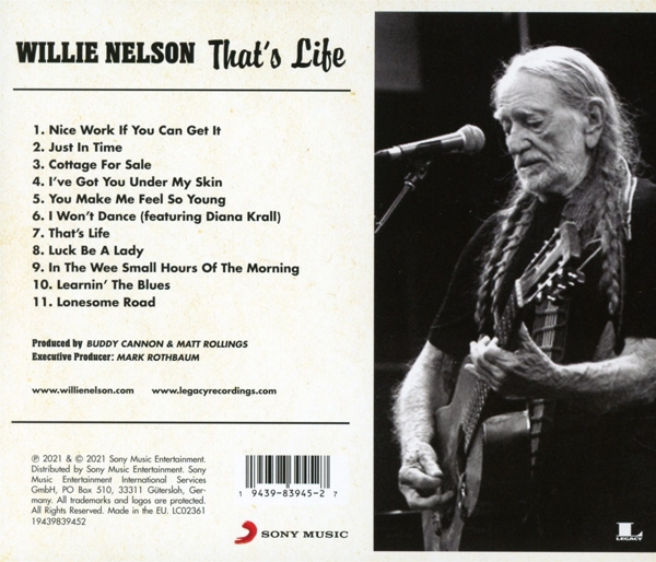 Beschreibung:2021 release. Honoring the enduring inspiration of Frank Sinatra, That's Life is Willie Nelson's second album of classics made famous by The Chairman Of The Board. Willie's first ode to Frank, 2018's My Way, earned Willie the Grammy for Best Traditional Pop Solo Album, and That's Life finds Nelson (who has penned a few standards himself) inhabiting 11 more of the most treasured songs in the Great American Songbook including the title track, "Luck Be A Lady," "Nice Work If You Can Get It," "I've Got You Under My Skin," "You Make Me Feel So Young," and "I Won't Dance" (a duet featuring Diana Krall). Produced by Buddy Cannon and Matt Rollings, That's Life was recorded at Capitol Studios in Hollywood-where Frank Sinatra, created a string of album masterpieces-with additional recording at Pedernales Studios in Austin, Texas., Runningtime: 00:00:00, Alto Saxophone: Mark Douthit, Art Direction, Design: Frank Harkins, Baritone Saxophone: Doug Moffet, Coordinator [Production Coordinator]: Shannon Finnegan, Copyist: Stephen Lamb, Drums, Tambourine, Handclaps [Hand Claps]: Jay Bellerose, Electric Guitar, Acoustic Guitar, Handclaps [Hand Claps]: Dean Parks, Engineer [Additional Engineers]: Dan Rudin, Engineer [Additional Engineers]: Matt Rollings, Engineer [Additional Engineers]: Paul Silveira, Engineer [Assistant Engineers]: Charlie Kramsky, Engineer [Assistant Engineers]: Jeff Fitzpatrick, Engineer [Assistant Engineers]: Lucas Glenney-Tagtmeier, Engineer [Assistant Engineers]: Sean Badum, Engineer [Assistant Engineers]: Shane Burgess, Engineer [Assistant Engineers]: Spencer Bleasdale, Executive-Producer, Executive-Producer [Executive Producer]: Mark Rothbaum, Guitar [Trigger]: Willie Nelson, Handclaps [Hand Claps]: Buddy Cannon, Handclaps [Hand Claps]: Ed Cherney, Handclaps [Hand Claps]: Matt Forbes, Harmonica: Mickey Raphael, Illustration: Paul Mann (4), Mastered By: Eric Boulanger (2), Mixed By: Al Schmitt, Mixed By: Niko Bolas, Mixed By [Assisted By]: Chandler Harrod, Orchestrated By [Horns Orchestrated By]: Chris McDonald, Orchestrated By [Strings Orchestrated By]: Kristin Wilkinson, Photography By [Back Photo]: James Minchin III, Piano, Electric Organ [B-3 Organ], Vibraphone, Handclaps [Hand Claps], Arranged By: Matt Rollings, Producer [Produced By]: Buddy Cannon, Producer [Produced By]: Matt Rollings, Recorded By: Ed Cherney, Recorded By: Steve Chadie, Recorded By: Tony Castle, Steel Guitar: Paul Franklin, Strings: Alison Hoffman, Strings: Carolyn Bailey, Strings: Conni Ellisor, Strings: Connie Heard, Strings: David Angell, Strings: David Davidson, Strings: Karen Winkelmann, Strings: Kevin Bate (2), Strings: Kristin Wilkinson, Strings: Monisa Angell, Strings: Paul Nelson (2), Strings: Sarighani Reist, Tenor Saxophone: Jeff Coffin, Trombone: Barry Green, Trombone: Chris McDonald, Trumpet: Mike Haynes, Trumpet, Piccolo Trumpet: Steve Patrick (2), Written-By: George & Ira Gershwin, Written-By: Adolph Green, Written-By: Betty Comden, Written-By: Jule Styne, Written-By: Larry Conley, Written-By: Willard Robison, Written-By: Cole Porter, Written-By: Josef Myrow, Written-By: Mack Gordon, Written-By: Dorothy Fields, Written-By: Jerome Kern, Written-By: Jimmy McHugh, Written-By: Oscar Hammerstein II, Written-By: Otto Harbach, Written-By: Dean Kay, Written-By: Kelly Gordon, Written-By: Frank Loesser, Written-By: Bob Hilliard, Written-By: David Mann (3), Written-By: Dolores Vicki Silvers, Written-By: Gene Austin, Written-By: Nathaniel Shilkret, Labelcode SNYL983945.2 (19439839452, 19439839452), Record Company Sony Music Entertainment International Services GmbH, Distributed By Sony Music Entertainment, Phonographic Copyright (p) Sony Music Entertainment, Copyright (c) Sony Music Entertainment, Made By Sony Music, Recorded At Capitol Studios, Recorded At Pedernales Studio, Recorded At Dan Rudin Recording & Production, Recorded At Blackbird Studio, Recorded At The Practice Room, Nashville TN, Recorded At Armoury Studios, Mixed At Capitol Studios, Mastered At The Bakery (2), Glass Mastered At Sonopre