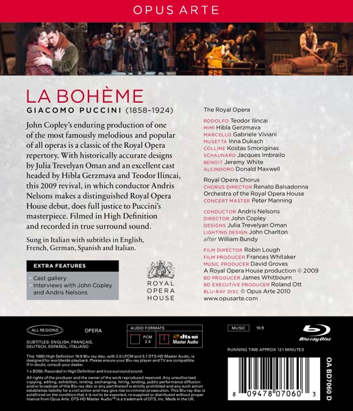| | Beschreibung: | Teodor Ilincai, Hibla Gerzmava, Gabriele Viviani, and Inna Dukach star in this 2009 Royal Opera production of the Puccini opera conducted by Andris Nelsons and directed by John Copley., Runningtime: 00:00:00, Authoring, Film Technician [Design & Encoding]: EPC (4), Booklet Editor: Charlotte De Grey, Chorus: Chorus Of The Royal Opera House, Covent Garden, Chorus: Tiffin Boys' Choir, Chorus Master [Royal Opera Chorus]: Renato Balsadonna, Chorus Master [Tiffin Children's Chorus]: Simon Toyne, Composed By: Giacomo Puccini, Concertmaster [Orchestra Of The Royal Opera House]: Peter Manning, Conductor: Andris Nelsons, Coordinator [Production Coordinator]: Chloë Carleton, Coordinator [Publications Coordinator]: Elle De La Mare, Design [Packaging Design]: Smith & Gilmour, Directed By [Director]: John Copley, Executive-Producer [BD Executive Producer]: Roland Ott, Film Director: Robin Lough, Film Producer: Frances Whitaker, Libretto By: Giuseppe Giacosa, Libretto By: Luigi Illica, Lighting [Lighting Design After]: William Bundy, Lighting [Lighting Design]: John Charlton (5), Liner Notes: Linda Fairtile, Liner Notes [Translation]: Day For Night (3), Orchestra: Orchestra Of The Royal Opera House, Covent Garden, Other [Subtitles]: ECI, Photography By [All Photos]: Johan Persson (7), Producer [BD Producer]: James Whitbourn, Producer [Music Producer]: David Groves, Set Designer [Designs]: Julia Trevelyan Oman, Text By [After Scénes De La Vie De Bohéme By]: Henri Murger, Vocals [Alcindoro, A Councillor Of State]: Donald Maxwell, Vocals [Benoit]: Jeremy White, Vocals [Colline, A Philosopher]: Kostas Smoriginas (2), Vocals [Marcello, A Painter]: Gabriele Viviani, Vocals [Mimì]: ????? ????????, Vocals [Musetta]: Inna Dukach, Vocals [Parpignol, A Toyseller]: Alan Duffield, Vocals [Rodolfo, A Poet]: Teodor Ilincai, Vocals [Schaunard, A Musician]: Jacques Imbrailo, Vocals [Sergeant]: Bryan Secombe, Labelcode BOPU7060BR (OA BD7060 D), Copyright (c) Royal Opera House, Copyright (c) Opus Arte, Recorded At Royal Opera House, Pressed By Sony Music |  | | Darsteller: |