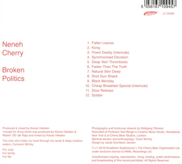 | | Beschreibung: | 2018 release. How do we conduct ourselves in extraordinary times? By what metric do we judge our own capacity to make change? In an era where the signal-to-noise ratio is more uneven than ever, what are the measures we must take to retain and remember our own personhood? Neneh Cherry's extraordinary fifth solo album, Broken Politics, asks these questions and more-searching for answers, patiently and with great care, and with a fearlessness to acknowledge that sometimes the answers don't even exist. It's a record that's equal parts angry, thoughtful, melancholy, and emboldening, as Cherry and her collaborators continue to expand her ever-widening sonic palette to craft truly singular and potent electronic pop., Runningtime: 00:00:00, Advisor [Spiritual Advisor And Anthropology]: Tyson McVey, Design: Jacob Grönbech Jensen, Photography By, Artwork [Frontcover Artwork]: Wolfgang Tillmans, Producer: Robert Del Naja, Producer, Mixed By: Kieran Hebden, Written-By: Cameron McVey, Written-By: Kieran Hebden, Written-By: Neneh Cherry, Written-By: Paul Simm, Performer [Sample From "The Is The Hardest Version"]: King Tubby, Performer [Sample From "The Is The Hardest Version"]: The Aggrovators, Written-By: Cameron McVey, Written-By: Euan Dickinson, Written-By: Kieran Hebden, Written-By: Neneh Cherry, Written-By: Robert Del Naja, Written-By [Sample From "The Is The Hardest Version"]: Bunny Lee, Written-By: Suliaman El-Hadi, Composed By [Sample From "Rusty Ships & Sand Castles"], Performer [Sample From "Rusty Ships & Sand Castles"]: Dick McGarvin, Vibraphone: Karl Berger, Written-By: Cameron McVey, Written-By: Kieran Hebden, Written-By: Neneh Cherry, Written-By: Cameron McVey, Written-By: John Tonks, Written-By: Kieran Hebden, Written-By: Neneh Cherry, Written-By: Ben Page, Written-By: Cameron McVey, Written-By: Kieran Hebden, Written-By: Neneh Cherry, Composed By [Sample From "Growing Up"], Performer [Sample From "Growing Up"]: Ornette Coleman, Written-By: Cameron McVey, Written-By: Kieran Hebden, Written-By: Neneh Cherry, Written-By: Ornette Coleman, Written-By: Paul Simm, Written-By: Cameron McVey, Written-By: Kieran Hebden, Written-By: Neneh Cherry, Written-By: Cameron McVey, Written-By: Kieran Hebden, Written-By: Neneh Cherry, Written-By: Paul Simm, Written-By: Cameron McVey, Written-By: Kieran Hebden, Written-By: Neneh Cherry, Written-By: Cameron McVey, Written-By: Kieran Hebden, Written-By: Neneh Cherry, Written-By: Paul Simm, Written-By: Preetesh Hirji, Written-By: Cameron McVey, Written-By: Kieran Hebden, Written-By: Neneh Cherry, Written-By: Paul Simm, Labelcode SMSP343.2 (STS343CD), Copyright (c) Smalltown Supersound, Phonographic Copyright (p) Smalltown Supersound, Copyright (c) The Cherry Bear Organisation Ltd., Phonographic Copyright (p) The Cherry Bear Organisation Ltd., Manufactured By Optimal Media GmbH, Licensed To AWAL Recordings Ltd, Published By Copyright Control, Published By Universal Music Publishing, Published By Music Rights Management Ltd., Published By BMG Rights Management (UK) Limited, Published By Phrase Text Music, Published By Kobalt Music Copyrights (UK) Limited, |  | | Anzahl der Titel: |