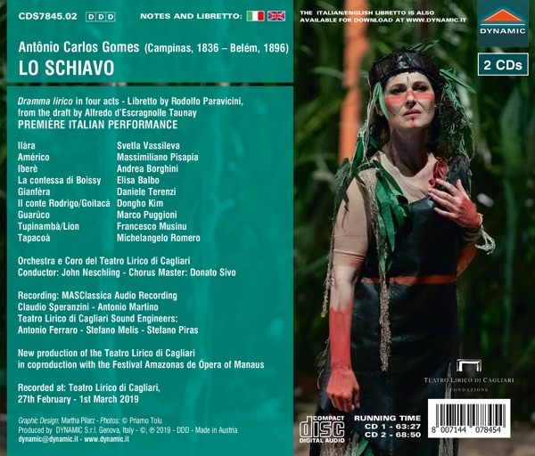 | | Beschreibung: | Brazilian composer Antônio Carlos Gomes was among the many musicians who travelled to Italy to master the language and the rules of operatic works. He studied in Milan and succeeded in having a few operas staged at Italian venues, before returning to Brazil where he was hailed as the most famous living national composer. Gomes felt compelled to commit his work to the country's anti-slave cause, which was still legal practice then. Lo schiavo was therefore conceived as a politically engaged work. However, the issue was rather volatile and the composer had to change the contemporary time setting to a more distant one. In Brazil the opera was a triumph, but elsewhere it failed to gain popularity and soon fell into oblivion. This recording of the Teatro Lirico di Cagliari's production documents the opera's first performance in modern times and reveals Gomes' flamboyant richness of melodic creativity, his sound grasp of construction, and a technical mastery of the theatrical mechanisms that are always of the highest level. "The most popular title of the entire Brazilian repertoire. The most represented and, perhaps, the most loved one." (John Neschling, conductor), Runningtime: 00:00:00, Labelcode DNMC7845.2 |  | | Darsteller: |