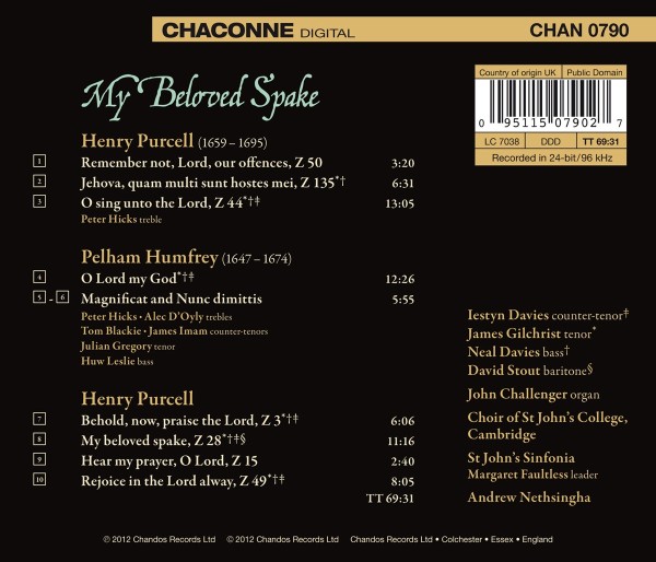 On this disc the Choir of St John's College Cambridge and the St John's Sinfonia conducted by Andrew Nethsingha perform choral works by Pelham Humfrey and Henry Purcell including O sing unto the Lord. Four soloists join them: British Countertenor Iestyn Davies James Gilchrist Neal Davies and David Stout., Runningtime: 00:00:00, Labelcode CHN790.2