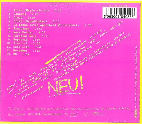 | | Beschreibung: | Artwork [Adaption Album Artwork 2010]: Michael Rother, Artwork [Adaption Album Artwork 2010]: Miki Yui, Artwork [Adaption Album Artwork 2010]: Walter Schönauer, Artwork [Original Artwork Front Cover]: Klaus Dinger, Engineer [Basic Tracks]: Michael Grund, Guitar, Bass, Keyboards, Synthesizer [Fairlight Music Computer]: Michael Rother, Illustration [Drawing]: Klaus Dinger, Mastered By [Master & Servant]: Tom Meyer, Mastered By [Reworked By]: Michael Rother, Photography By: Michael Rother, Producer, Recorded By, Mixed By, Performer, Composed By, Programmed By: Klaus Dinger, Producer, Recorded By, Mixed By, Performer, Composed By, Programmed By: Michael Rother, Vocals, Drums, Guitar, Keyboards: Klaus Dinger, Drums: Siggi Sessenhausen, Drums: Siggi Sessenhausen, Voice: Birgit (5), Voice: Jochen, Bass, Sounds [Percussive]: Michael Grund, Drums: Siggi Sessenhausen, Drums: Siggi Sessenhausen, Labelcode GRLN4.2 (CDGRONIV, 5065001040856), Manufactured By Optimal Media Production, Produced At Grundfunk Studio, Recorded At Grundfunk Studio, Mixed At Grundfunk Studio, Produced At Dingerland-Lilienthal Studio, Recorded At Dingerland-Lilienthal Studio, Mixed At Dingerland-Lilienthal Studio, Produced At Harmonia Studio Forst, Recorded At Harmonia Studio Forst, Mixed At Harmonia Studio Forst, Mastered At Master & Servant |  | | Anzahl der Titel: |