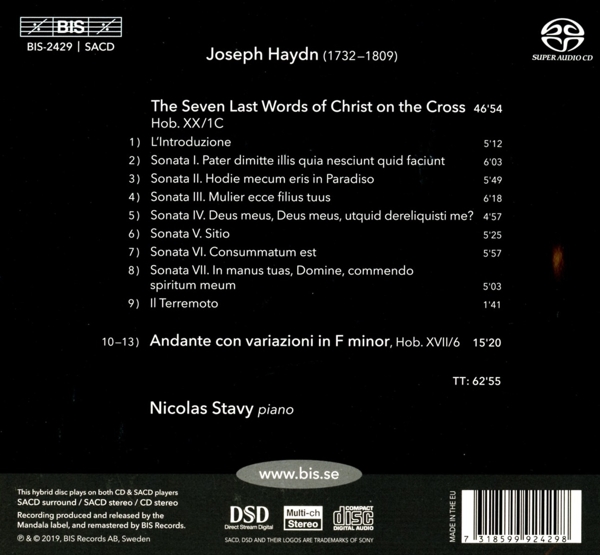 Die sieben letzten Worte unseres Erl?sers am Kreuze Hob. XX:1 (Oratorium, Instrumentalfassung) 01. "1. Introduktion" 02. "2. Sonate 1: Pater dimitte illis quia nesciunt quid faciunt" 03. "3. Sonate 2: Hodie mecum eris in Paradiso" 04. "4. Sonate 3: Mulier ecce filius tuus" 05. "5. Sonate 4: Deus meus, Deus meus, utquid dereliquisti me?" 06. "6. Sonate 5: Sitio" 07. "7. Sonate 6: Consummatum est" 08. "8. Sonate 7: In manus tuas, Domine, commendo spiritum meum" 09. "9. Il Terremoto" Stücke für Klavier Hob. XVII:6 (Andante con variazioni f-moll) 10. "1. Thema: Andante" 11. "2. Variation 1" 12. "3. Variation 2" 13. "4. Coda"