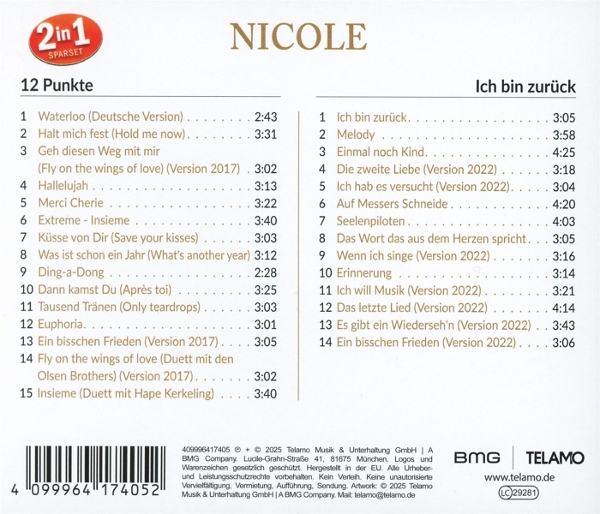 Beschreibung:"2in1 Vol.3" ist eine besondere CD-Veröffentlichung der bekannten deutschen Sängerin Nicole und erscheint beim renommierten Label Telamo. Diese Edition vereint zwei klassische Alben von Nicole auf einer CD und bietet ihren Fans ein musikalisches Erlebnis voller Gefühl und eingängiger Melodien aus Pop- und Schlagermusik. Seit ihrem internationalen Durchbruch mit dem Gewinn des Eurovision Song Contests 1982 ("Ein bißchen Frieden") begeistert Nicole mit ihrer klaren Stimme und zahlreichen Hits die Musikwelt ? sie zählt zu den erfolgreichsten Künstlerinnen im deutschsprachigen Raum. Das Label Telamo steht für hochwertige Produktionen im Bereich Schlager & Popmusik aus Deutschland sowie für die Förderung namhafter Künstler wie Nicole.