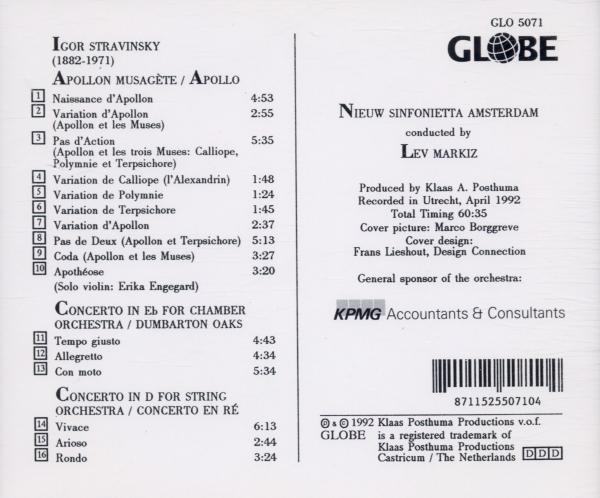 Beschreibung:Bassoon [Nieuw Sinfonietta Amsterdam: Bassoon]: Ronald Karten, Clarinet [Nieuw Sinfonietta Amsterdam: Clarinet]: Frank Van Den Brink (2), Composed By: Igor Stravinsky, Conductor: Lev Markiz, Design [Cover Design]: Frans Lieshout, Double Bass [Nieuw Sinfonietta Amsterdam: Double Bass]: Anneke Hogenstijn, Double Bass [Nieuw Sinfonietta Amsterdam: Double Bass]: Niko Ravenstijn, Flute [Nieuw Sinfonietta Amsterdam: Flute]: Harrie Starreveld, Horn [Nieuw Sinfonietta Amsterdam: Horn]: Jan Harshagen, Horn [Nieuw Sinfonietta Amsterdam: Horn]: Remko Kraamwinkel, Orchestra: Nieuw Sinfonietta Amsterdam, Photography By [Cover Picture]: Marco Borggreve, Producer: Klaas Posthuma, Viola [Nieuw Sinfonietta Amsterdam: Viola]: Arianne In 't Velt, Viola [Nieuw Sinfonietta Amsterdam: Viola]: Els Goossens, Viola [Nieuw Sinfonietta Amsterdam: Viola]: Julie Barnes (3), Viola [Nieuw Sinfonietta Amsterdam: Viola]: Liesbeth Steffens, Viola [Nieuw Sinfonietta Amsterdam: Viola]: Marjolein Knaven, Viola [Nieuw Sinfonietta Amsterdam: Viola]: Ruben Sanderse, Viola [Nieuw Sinfonietta Amsterdam: Viola]: Satu Vaananen, Violin [Nieuw Sinfonietta Amsterdam: Violin]: Alexej Pevzner, Violin [Nieuw Sinfonietta Amsterdam: Violin]: Alida Schat, Violin [Nieuw Sinfonietta Amsterdam: Violin]: Christian Höfer (2), Violin [Nieuw Sinfonietta Amsterdam: Violin]: Claire Huydts, Violin [Nieuw Sinfonietta Amsterdam: Violin]: Clara James, Violin [Nieuw Sinfonietta Amsterdam: Violin]: Diana Morris, Violin [Nieuw Sinfonietta Amsterdam: Violin]: Erika Engegard, Violin [Nieuw Sinfonietta Amsterdam: Violin]: Ernst Grapperhaus, Violin [Nieuw Sinfonietta Amsterdam: Violin]: Franc Polman, Violin [Nieuw Sinfonietta Amsterdam: Violin]: Gerrie Rodenhuis, Violin [Nieuw Sinfonietta Amsterdam: Violin]: Giles Francis, Violin [Nieuw Sinfonietta Amsterdam: Violin]: Helma Leenhouts, Violin [Nieuw Sinfonietta Amsterdam: Violin]: Jacobien Rozemond, Violin [Nieuw Sinfonietta Amsterdam: Violin]: Josje Ter Haar, Violin [Nieuw Sinfonietta Amsterdam: Violin]: Karen Segal (2), Violin [Nieuw Sinfonietta Amsterdam: Violin]: Margarete Adorf, Violin [Nieuw Sinfonietta Amsterdam: Violin]: Marie-José Schrijner, Violin [Nieuw Sinfonietta Amsterdam: Violin]: Nelleke Scholten, Violin [Nieuw Sinfonietta Amsterdam: Violin]: Petra Griffioen, Violoncello [Nieuw Sinfonietta Amsterdam: Violoncello]: Albert Brüggen, Violoncello [Nieuw Sinfonietta Amsterdam: Violoncello]: Eelco Beinema, Violoncello [Nieuw Sinfonietta Amsterdam: Violoncello]: Jan Insinger, Violoncello [Nieuw Sinfonietta Amsterdam: Violoncello]: Koen Schouten, Violoncello [Nieuw Sinfonietta Amsterdam: Violoncello]: Maarten Mostert, Violoncello [Nieuw Sinfonietta Amsterdam: Violoncello]: Michiel Weidner, Violoncello [Nieuw Sinfonietta Amsterdam: Violoncello]: Susanne Degerfors, Labelcode GLO5071.2 (GLO 5071), Phonographic Copyright (p) Klaas Posthuma Productions v.o.f., Copyright (c) Klaas Posthuma Productions v.o.f., Designed At Design Connection, Made By P+O Pallas