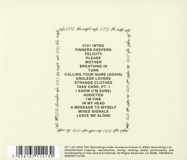 01. "0151 Intro" 02. "Finders keepers" 03. "Felicity" 04. "Please" 05. "Mother" 06. "Breathing in" 07. "Turn" 08. "Calling your name (Again)" 09. "Endless lovers" 10. "Strangers clothes" 11. "Take care (Pt 1)" 12. "I know (I'm Sure)" 13. "Addicted" 14. "I'm fine" 15. "In my head" 16. "A message to myself" 17. "Mixed signals" 18. "Leave me alone"