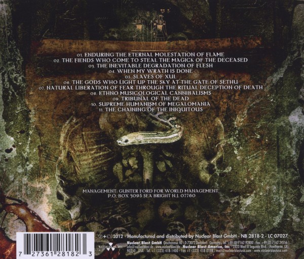 01. "Enduring The Eternal Molestation Of Flame" 02. "The Fiends Who Come To Steal The Magick Of The Deceased" 03. "The Inevitable Degradation Of Flesh" 04. "When My Wrath Is Done" 05. "Slaves Of Xul" 06. "The Gods Who Light Up The Sky At The Gate Of Sethu" 07. "Natural Liberation Of Fear Through The Ritual Deception Of Death" 08. "Ethno-Musicological Cannibalisms" 09. "Tribunal Of The Dead" 10. "Supreme Humanism Of Megalomania" 11. "The Chaining Of The Iniquitous"