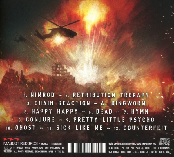 01. "Nimrod" 02. "Retribution therapy" 03. "Chain reaction" 04. "Ringworm" 05. "Happy happy" 06. "Dead" 07. "Hymn" 08. "Conjure" 09. "Pretty little psycho" 10. "Ghost" 11. "Sick like me" 12. "Counterfeit"