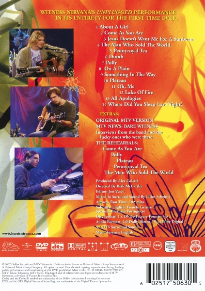 1.1 About a Girl [DVD]1.2 Come As You Are [DVD]1.3 Jesus Doesn't Want Me for a Sunbeam [DVD]1.4 The Man Who Sold the World [DVD]1.5 Pennyroyal Tea [DVD]1.6 Dumb [DVD]1.7 Polly [DVD]1.8 On a Plain [DVD]1.9 Something in the Way [DVD]1.10 Sweet Home Alabama [DVD]1.11 Plateau [DVD]1.12 Oh, Me [DVD]1.13 Lake of Fire [DVD]1.14 All Apologies [DVD]1.15 Where Did You Sleep Last Night? [DVD]1.16 About a Girl [Original MTV Version]1.17 Come As You Are [Original MTV Version]1.18 Jesus Doesn't Want Me for a Sunbeam [Original MTV Version]1.19 Dumb [Original MTV Version]1.20 The Man Who Sold the World [Original MTV Version]1.21 Pennyroyal Tea [Original MTV Version]1.22 Polly [Original MTV Version]1.23 On a Plain [Original MTV Version]1.24 Plateau [Original MTV Version]1.25 Lake of Fire [Original MTV Version]1.26 All Apologies [Original MTV Version]1.27 Where Did You Sleep Last Night? [Original MTV Version]1.28 Bonus Material [DVD] |