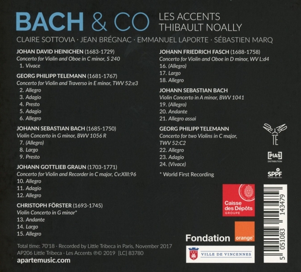 Konzert für Violine und Oboe c-moll S 240 (Auszug) 01. "1. Vivace" Konzert für Violine, Querfl?te, Streicher und Basso continuo e-moll TWV 52:e3 02. "1. Allegro" 03. "2. Adagio" 04. "3. Presto" 05. "4. Adagio" 06. "5. Allegro" Konzert für Cembalo, Streicher und Basso continuo Nr. 5 f-moll BWV 1056 (für Violine g-moll) 07. "1. Allegro" 08. "2. Largo" 09. "3. Presto" Konzert für Violine, Blockfl?te, Streicher und Basso continuo C-Dur 10. "1. Allegro" 11. "2. Adagio" 12. "3. Allegro" Konzert für Violine g-moll 13. "1. Andante" 14. "2. Largo" 15. "3. Allegro" Konzert für Violine, Oboe, Streicher und Basso continuo d-moll 16. "1. Allegro" 17. "2. Largo" 18. "3. Allegro" Konzert für Violine, Streicher und Basso continuo Nr. 1 a-moll BWV 1041 19. "1. Allegro" 20. "2. Andante" 21. "3. Allegro assai" Konzert für 2 Violinen, Streicher und Basso continuo C-Dur TWV 52:C2 22. "1. Allegro" 23. "2. Adagio" 24. "3. Vivace"