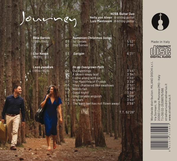 Beschreibung:"In Journey, our second album, we have turned our attention to the Eastern European sounds of Bartók and Janácek and beyond with a new piece written especially for us by Israeli composer Lior Navok. The programme is somewhat less exuberant than our fiery and extroverted first album, Sortilegios, from 2019. This time, we invite the listener on a contemplative journey, reconnecting with deep emotions, ancestral memories and far-away landscapes. While it looks inward from an emotional point of view, Journey also broadens the expressive limits of our ensemble, showcasing a repertoire that may already be familiar to music lovers but is presented here for the first time in guitar duo arrangements." (Nelly & Luiz), Runningtime: 00:00:00, Ensemble: NOVA Guitar Duo, Guitar [6-String Guitar]: Nelly Von Alven, Guitar [8-String Guitar]: Luiz Mantovani, Composed By: Béla Bartók, Composed By: Lior Navok, Composed By: Leo? Janá?ek, Labelcode STU37209.2 (STR 37209), Distributed By Milano Dischi s.r.l.