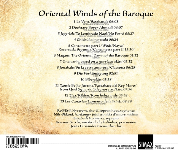01. "Sereba/Nystrom: Le vent - Couperin: Konzert Nr. 14: Sarabande" 02. "Dochtare boyer ahmadi" 03. "Sereba: Jegerlek - Da Rabeca: To lembrado nao! - Nystrom/Sereba - No forr¢" 04. "Chichukai no tsuki" 05. "Merula: Canzonetta sprituale über Alla Nanna - Sereba: Wodi - Naya - Ortiz: Recercada Nr. 2 - Merula: Canzonetta..." 06. "Maqam: The oriental dawn of the baroque" 07. "Gnawar'n (nach Gorrlaus Sl?tt von Vidar Lande)" 08. "Sereba: Jonabalo - Merula: Su la cetra amorosa - Falconieri: Chaconne" 09. "Rosenkranz-Sonate Nr. 1 (Die Verkündigung Mariae)" 10. "Bibersl?tt" 11. "Sereba: Tantie Beiko Justine - De Narváez: Paseabase del rey moro - Monteverdi: Quel sguardo sdegnosetto - Sereba: Lisa" 12. "Sereba: Ziza - Vigdal: Kilden - Kom helge ande" 13. "Gaultier: Les Canaries - Monteverdi: Amor, dicea... Lamento della ninfa"