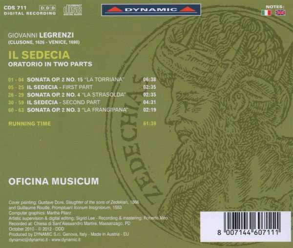 Sonate op. 2 Nr. 15 "La Torriana" 01. Favero, Riccardo "1. Allegro" 02. Favero, Riccardo "2. Adagio" 03. Favero, Riccardo "3. Adagio" 04. Favero, Riccardo "4. Allegro" Il Sedecia (Oratorium in 2 Teilen) (1. Teil) 05. Arrivabene, Andrea "Chor: Alla fuga, alla fuga" 06. Arrivabene, Andrea "Rezitativ: Cosi mentre dall'armi oppressa, e cinta" 07. Arrivabene, Andrea "Rezitativ: Addio mia reggia, addio" 08. Arrivabene, Andrea "Arie: Io vi perdo, e v' abbandono" 09. Arrivabene, Andrea "Rezitativ: Ma poich? avverso inesorabil Fato" 10. Arrivabene, Andrea "Arie: Armatevi il petto" 11. Arrivabene, Andrea "Rezitativ: Con tai voci premendo" 12. Arrivabene, Andrea "Rezitativ: Al luminoso lampo" 13. Arrivabene, Andrea "Arie: Son volubili pi? d'aura" 14. Arrivabene, Andrea "Rezitativ: A tanti illustri esempi" 15. Arrivabene, Andrea "Arie: Bella guancia, ch'al candore" 16. Arrivabene, Andrea "Rezitativ: Incoraggiti, e rincorati insieme" 17. Arrivabene, Andrea "Trio: Duri scogli degl'affanni" 18. Arrivabene, Andrea "Rezitativ: Ma perch? pigra, e lenta" 19. Arrivabene, Andrea "Rezitativ: Cos dolente, e mesto" 20. Arrivabene, Andrea "Chor: Vivi, vivi, tra la gloria" 21. Arrivabene, Andrea "Rezitativ: Lusingava in tal guisa" 22. Arrivabene, Andrea "Arie: Dal mio braccio fulminante" 23. Arrivabene, Andrea "Rezitativ: Ove pu? mai" 24. Arrivabene, Andrea "Rezitativ: Appena udissi il suon di questi accenti" 25. Arrivabene, Andrea "Madrigal: Quanto deliri, o quanto" Sonate op. 2 Nr. 4 "La Strasolda" 26. Favero, Riccardo "1. Presto" 27. Favero, Riccardo "2. Adagio" 28. Favero, Riccardo "3. Allegro" 29. Favero, Riccardo "4. Presto" Il Sedecia (Oratorium in 2 Teilen) (2. Teil) 30. Arrivabene, Andrea "Rezitativ: Dopo longo viaggio" 31. Arrivabene, Andrea "Arie: Quest'ondo fugace" 32. Arrivabene, Andrea "Arie: Quest'aura, che grata" 33. Arrivabene, Andrea "Duett: Tutt' il tempo dissolve" 34. Arrivabene, Andrea "Rezitativ: Coraggiosi miei figli" 35. Arrivabene, Andrea "Rezitativ: Di gi? l'alba vicina" 36. Arrivabene, Andrea "Chor: Siete vinti, e prigionieri" 37. Arrivabene, Andrea "Rezitativ: Cinti d'aspre ritorte" 38. Arrivabene, Andrea "Rezitativ: Pur al fine ti giunse" 39. Arrivabene, Andrea "Arie: Su su svenategli" 40. Arrivabene, Andrea "Rezitativ: Ferma, trattieni il ferro" 41. Arrivabene, Andrea "Rezitativ: Saziati pur spietato" 42. Arrivabene, Andrea "Arioso: E sarammi la morte" 43. Arrivabene, Andrea "Rezitativ: No, no la tua fierezza" 44. Arrivabene, Andrea "Arioso: Sar? contento a pieno" 45. Arrivabene, Andrea "Rezitativ: Sar? lieta mia sorte" 46. Arrivabene, Andrea "Rezitativ: Ma inferocito, indocile il tiranno" 47. Arrivabene, Andrea "Rezitativ: Troncher? il cenno mio" 48. Arrivabene, Andrea "Rezitativ: Cos cader trafitti" 49. Arrivabene, Andrea "Duett: Padre, padre io manco" 50. Arrivabene, Andrea "Rezitativ: Al miserando oggetto" 51. Arrivabene, Andrea "Rezitativ: Che ti par re superbo" 52. Arrivabene, Andrea "Arioso: E che puote mirar la gloria mia" 53. Arrivabene, Andrea "Rezitativ: Cos trasser le luci all'infelice" 54. Arrivabene, Andrea "Arie: Nabucco hai vinto, hai vinto" 55. Arrivabene, Andrea "Arie: So mortal Sisifo insano" 56. Arrivabene, Andrea "Rezitativ: Offesi i tuoi decreti" 57. Arrivabene, Andrea "Arioso: O figli, o luci, o ciel, o patria, o regno" 58. Arrivabene, Andrea "Rezitativ: Iddio coglie, e non erra" 59. Arrivabene, Andrea "Madrigal: Mortali apprendete" Sonate op. 2 Nr. 3 "La Frangipana" 60. Favero, Riccardo "1. Allegro" 61. Favero, Riccardo "2. Allegro" 62. Favero, Riccardo "3. Adagio" 63. Favero, Riccardo "4. Presto"