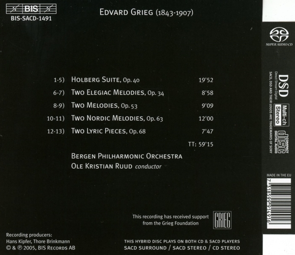 Beschreibung:Cello: Sebastian Dörfler, Composed By: Edvard Grieg, Conductor: Ole Kristian Ruud, Engineer: Jens Braun, Executive-Producer: Robert Suff, Leader, Violin: Øyvind Bjorå, Liner Notes: Sigvald Tveit, Liner Notes [Translated By]: Anke Budweg, Liner Notes [Translated By]: Arlette Lemieux-Chené, Liner Notes [Translated By]: William Jewson, Mixed By: Jens Braun, Mixed By: Thore Brinkmann, Oboe: Rainer Gibbons, Orchestra: Bergen Filharmoniske Orkester, Photography By: Birgit Wärstad, Producer: Hans Kipfer, Producer: Thore Brinkmann, Typography, Layout: Andrew Barnett, Labelcode BIS1491SACD (BIS-SACD-1491), Phonographic Copyright (p) BIS Records AB, Copyright (c) BIS Records AB, Recorded At Grieghallen