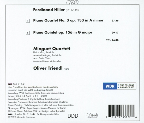 Beschreibung:Ferdinand Hiller was a figure of European renown during his lifetime, but unfortunately his work and activity were quickly forgotten after his death. The two works recorded here, the 3rd Piano Quartet (1870) and the Piano Quintet op. 156 (1872) represent the mature Hiller's weightiest contributions to chamber music. But despite their initial success, even these demanding pieces failed to gain a lasting foothold in the concert repertoire. While Hiller's early works were still clearly in the tradition of Hummel, the late ones clearly reflect the new standard that Schumann had set with his works of the 1840s. For his piano quartet, Hiller chose the key of A minor, which was considered passionate in the High Romantic period. For long stretches, this key determines the work's basic dramatic tone, which only brightens into a radiant A major in the finale. The piano part is too demanding to be performed in the context of house music. His Piano Quintet proves to be more of a lyrical counterpart to the Piano Quartet. The real surprise is that the theme of the final movement turns out to be a variant of the main theme of the first movement, bringing the quintet as a whole closer to a cyclical form., Runningtime: 00:00:00, Labelcode CPO555312.2