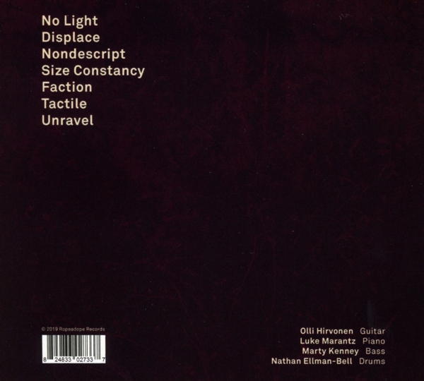 01. "No light" 02. "Displace" 03. "Nondescription" 04. "Size constancy" 05. "Faction" 06. "Tactile" 07. "Unravel"