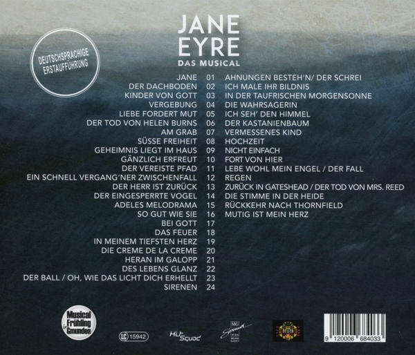 Disc 01 01. Sikorda, Elisabeth / Gasoy-Romdal, Yngve / Shamiyeh, Katharina / Schachinger, Niklas / Schuster, Heidelinde "Jane ("Jane Eyre")" 02. Sikorda, Elisabeth / Kozeluh, Dennis "Der Dachboden ("Jane Eyre")" 03. Schuster, Heidelinde / Shamiyeh, Katharina / Wiederstein, Carmen / Kozeluh, Dennis / +++ "Kinder von Gott ("Jane Eyre")" 04. Gassner, Anna / Reininger, Sarah / Shamiyeh, Katharina "Vergebung ("Jane Eyre")" 05. Gassner, Anna / Reininger, Sarah "Liebe fordert Mut ("Jane Eyre")" 06. Sikorda, Elisabeth / Shamiyeh, Katharina / Wiederstein, Carmen / Gassner, Anna / Reininger, Sarah / +++ "Der Tod von Helen Burns ("Jane Eyre")" 07. Shamiyeh, Katharina / Pimmingsdorfer, Alessia / Sikorda, Elisabeth "Am Grab ("Jane Eyre")" 08. Sikorda, Elisabeth / +++ "Süße Freiheit ("Jane Eyre")" 09. Sikorda, Elisabeth / Gasoy-Romdal, Yngve / Filipcic, Carin / Delos Santos, Leah / Kraml, Marcel-Philip / +++ "Geheimnis liegt im Haus ("Jane Eyre")" 10. Sikorda, Elisabeth / Filipcic, Carin / Schuster, Heidelinde / Wiederstein, Carmen / Straka, Roman / +++ "G?nzlich erfreut ("Jane Eyre")" 11. Sikorda, Elisabeth / Gasoy-Romdal, Yngve / +++ "Der vereiste Pfad ("Jane Eyre")" 12. Sikorda, Elisabeth "Ein schnell vergang'ner Zwischenfall ("Jane Eyre")" 13. Filipcic, Carin / Gasoy-Romdal, Yngve / Sikorda, Elisabeth / Straka, Roman / Zeilermayr, Ronja / +++ "Der Herr ist zurück ("Jane Eyre")" 14. Gasoy-Romdal, Yngve / Sikorda, Elisabeth "Der eingesperrte Vogel ("Jane Eyre")" 15. Sikorda, Elisabeth / Filipcic, Carin / Gasoy-Romdal, Yngve "Adeles Melodrama ("Jane Eyre")" 16. Gasoy-Romdal, Yngve "So gut wie sie ("Jane Eyre")" 17. Gasoy-Romdal, Yngve / Sikorda, Elisabeth "Bei Gott ("Jane Eyre")" 18. Sikorda, Elisabeth / Gasoy-Romdal, Yngve / Wiederstein, Carmen / +++ "Das Feuer ("Jane Eyre")" 19. Sikorda, Elisabeth / Gasoy-Romdal, Yngve "In meinem tiefsten Herz ("Jane Eyre")" 20. Filipcic, Carin / Sikorda, Elisabeth / Zeilermayr, Ronja / Danilkow, Romy "Die Creme de la creme ("Jane Eyre")" 21. Sikorda, Elisabeth / Gasoy-Romdal, Yngve / Filipcic, Carin / Delos Santos, Leah / Kraml, Marcel-Philip / +++ "Heran im Galopp ("Jane Eyre")" 22. Delos Santos, Leah / Filipcic, Carin / Sikorda, Elisabeth "Des Lebens Glanz ("Jane Eyre")" 23. Delos Santos, Leah / Gasoy-Romdal, Yngve / Sikorda, Elisabeth / Niemeyer, Max "Der Ball / Oh, wie das Licht dich erhellt ("Jane Eyre")" 24. Sikorda, Elisabeth / Wiederstein, Carmen "Sirenen ("Jane Eyre")"