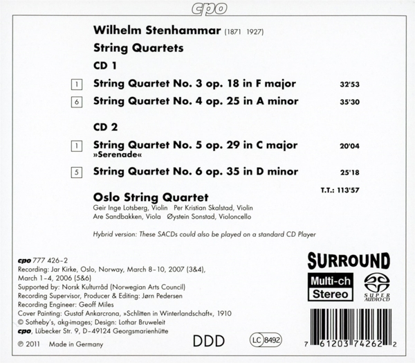 Beschreibung: | Cello [Violincello]: Øystein Sonstad, Composed By: Wilhelm Stenhammar, Ensemble: Oslo String Quartet, Viola: Are Sandbakken, Violin: Geir Inge Lotsberg, Violin: Per Kristian Skalstad, Labelcode CPO777426SACD (777 426-2), Recorded At Jar Kirke |