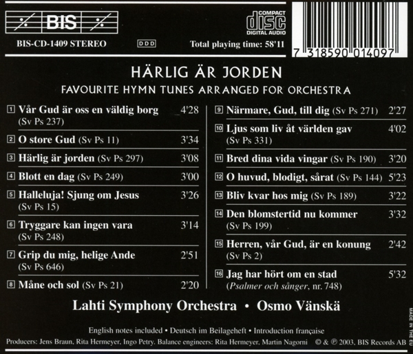 Beschreibung:Conductor: Osmo Vänskä, Cover, Photography By: Ingemar Hagerfors, Edited By: Michael Silberhorn, Edited By: Rita Hermeyer, Engineer: Martin Nagorni, Engineer: Rita Hermeyer, Layout: Andrew Barnett, Liner Notes [Translated By]: Arlette Lemieux-Chené, Liner Notes [Translated By]: Horst A. Scholz, Orchestra: Lahti Symphony Orchestra, Producer: Ingo Petry, Producer: Jens Braun, Producer: Rita Hermeyer, Arranged By: Herman Rechberger, Music By: Martin Luther (3), Arranged By: Jaakko Kuusisto, Music By: Carl Boberg, Arranged By: Ilkka Kuusisto, Arranged By: Ilkka Kuusisto, Music By: Oscar Ahnfelt, Arranged By: Osmo Vänskä, Music By: Rowland H. Prichard, Arranged By: Osmo Vänskä, Arranged By: Jaakko Kuusisto, Music By: Ilkka Kuusisto, Arranged By: Jaakko Kuusisto, Music By: Egil Hovland, Arranged By: Ilkka Kuusisto, Music By: Lowell Mason, Arranged By: Harri Ahmas, Arranged By: Ilkka Kuusisto, Arranged By: Harri Ahmas, Music By: Hans Leo Haßler, Arranged By: Ilkka Kuusisto, Music By: William Henry Monk, Arranged By: Jarkko Kiiski, Arranged By: Harri Ahmas, Music By: Joachim Neander, Arranged By: Ilkka Kuusisto, Labelcode BIS1409.2 (BIS-CD-1409), Phonographic Copyright (p) BIS Records AB, Copyright (c) BIS Records AB, Made By DADC Austria, Recorded At Ristinkirkko