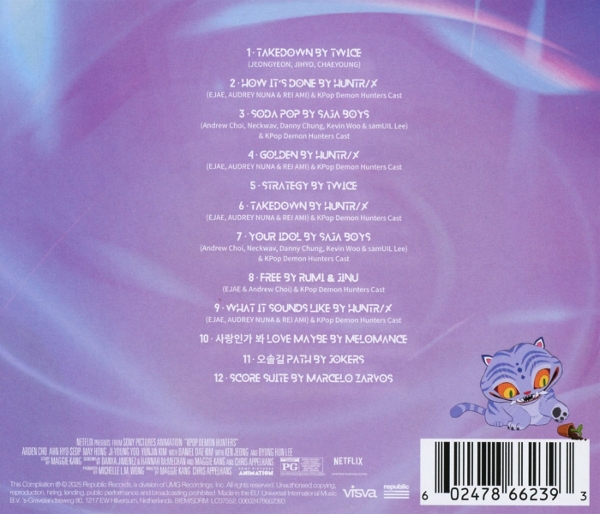 1.1 TAKEDOWN - TWICE (Jeongyeon, Jihyo, Chaeyoung)1.2 How It's Done - HUNTR/X (EJAE, Audrey Nuna, and REI AMI)1.3 Soda Pop - Saja Boys (Andrew Choi, Neckwav, Danny Chung, Kevin Woo, and samUIL Lee)1.4 Golden - HUNTR/X (EJAE, Audrey Nuna, and REI AMI)1.5 Strategy - TWICE1.6 TAKEDOWN - HUNTR/X (EJAE, Audrey Nuna, and REI AMI)1.7 Your Idol - Saja Boys (Andrew Choi, Neckwav, Danny Chung, Kevin Woo, and samUIL Lee)1.8 Free - Rumi and Jinu (EJAE and Andrew Choi)1.9 What It Sounds Like - HUNTR/X (EJAE, Audrey Nuna, and REI AMI)1.10 Love Maybe - MeloMance1.11 Path - Jokers1.12 Score Suite - Marcelo Zarvos |