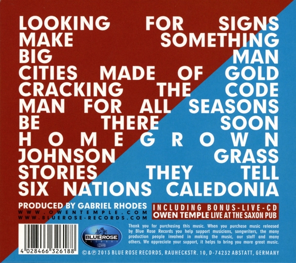 Disc 01 01. "Looking for signs" 02. "Make something" 03. "Big man" 04. "Cities made of gold" 05. "Cracking the code" 06. "Man for all seasons" 07. "Be there soon" 08. "Homegrown" 09. "Johnson grass" 10. "Stories they tell" 11. "Six nations Caledonia"
