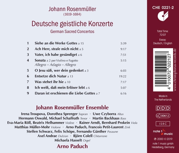 | Beschreibung: | Johann Rosenmüller (1619-1684) spent more than a decade at the Thomasschule in Leipzig and was already considered the new Thomaskantor when his promising career was abruptly interrupted: accused of pederasty, he had to flee Leipzig in 1655, went first to Hamburg and then to Venice, where he worked for the next 28 years. In Catholic Venice he wrote church music in Latin - the German sacred concerts presented on this release, however, probably all originate from his Leipzig period., Runningtime: 00:00:00, Labelcode CHS2212.2 |