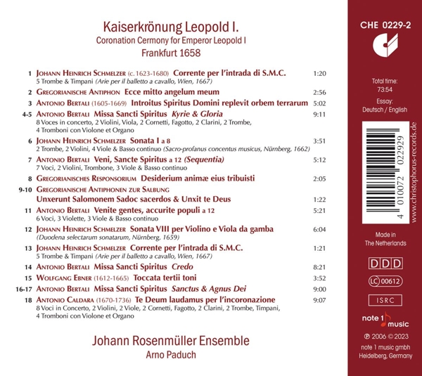 | Beschreibung: | ?The coronation of an emperor was a lengthy act of state that finally culminated in a magnificent coronation ceremony. For this, the most important composers of their time wrote the music and the best court bands travelled to perform it. After much research, the musician and musicologist Arno Paduch has compiled the music for the coronation of Emperor Leopold I in 1658, centring on a mass and coronation motets by Antonio Bertali. Timpani and trumpets, as a sign of imperial dignity, are of course not to be missed, and the Johann Rosenmüller Ensemble is also otherwise well cast with over thirty performers., Runningtime: 00:00:00, Labelcode CHS2292.2 |