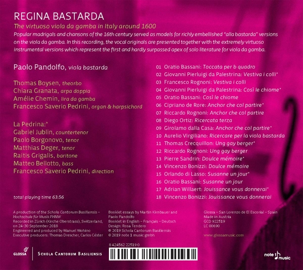 Beschreibung:Popular madrigals and chansons of the 16th century served as models for richly embellished "alla bastarda" versions on the viola da gamba. In this recording, the vocal originals are presented together with the extremely virtuoso instrumental versions which represent the first and hardly surpassed apex of solo literature for viola da gamba. For 25 years, Paolo Pandolfo has been one of the leading viola da gambists of his generation, researching and promoting the repertoire of his instruments in all directions. The thorough knowledge of all aspects of the viola da gamba repertoire becomes clear in his extensive discography. Not only has he recorded the most important works of the viol literature, but also very personal musical statements in which he combined the youthful experiences as a double bass player and guitarist with compositions and improvisations that are just as influenced by jazz as they are by the historical repertoire. With the bastarda diminutions, he now proffers an early milestone of the solo viol literature in which the exuberant virtuosity serves to present enchantingly beautiful music. On this very special project, with instruments built ad hoc, he is joined by some of the finest continuo players of the early music scene (Boysen, Granata, Chemin, Pedrini) and the exquisite vocal ensemble La Pedrina, together producing what definitely will be considered as a key recording of repertoire for the viola da gamba., Runningtime: 00:00:00, Labelcode GSA922519.2