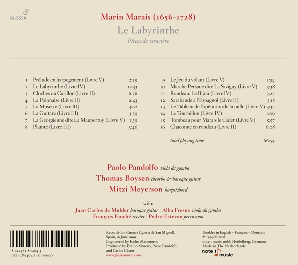Beschreibung:Paolo Pandolfo is no doubt one of Glossa's key artists. Still on the label since he joined it in 1995, this recording of a selection of works by Marin Marais was a milestone in his career. Rarely has this repertoire been played with such an energy and attention to detail, with such a magic in all it's many special moments. An all-star setup including Thomas Boysen, Mitzi Meyerson and Pedro Estevan tells us about the labyrinth at Versailles, the bells of Paris or a painful surgery. Among the many unforgettable moments are Pandolfo's reading of the Tombeau pour Marais le Cadet and the Chaconne. Paolo Pandolfo began his research in the field of Renaissance and Baroque music idioms around 1979 together with violinist Enrico Gatti and harpsichordist Rinaldo Alessandrini. In 1982 he became a member of J. Savall's ensemble Hesperion XX and played with him until 1990 throughout the world, and making dozens of recordings. In 1990, after the huge success of his first recording as a soloist he was nominated as Professor of viola da gamba at his alma mater, the Schola Cantorum Basiliensis in Basel., Composed By: Marin Marais, Edited By: Bertram Kornacher, Engineer: Isidro Matamoros, Guitar [Baroque]: Juan Carlos de Mulder, Guitar [Baroque]: Thomas Boysen, Harpsichord: Mitzi Meyerson, Percussion: Pedro Estevan, Producer: Carlos Céster, Producer: Emilio Moreno, Producer: Paolo Pandolfo, Theorbo: Thomas Boysen, Viol [Bass de Viole]: Alba Fresno, Viola da Gamba: Paolo Pandolfo, Vocals [Reciter]: François Fauché, Labelcode GSA80404.2 (GCD C80404)