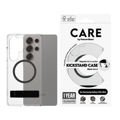 PanzerGlass CARE™ by ® Case Transparent m. Schwarz Kickstand & Qi Compatible Samsung Galaxy S25 Ultra Panzerglass