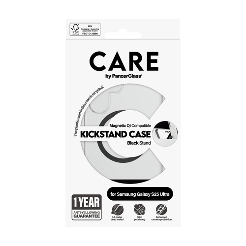 Das CARE by PanzerGlass Case Transparent Black mit Kickstand und Qi-Kompatibilität für das Samsung Galaxy S25 Ultra ist eine hochwertige Schutzhülle, die robusten Schutz bietet und gleichzeitig stilvoll sowie funktional bleibt. Gefertigt aus hochwertigen recycelten Materialien präsentiert sich das schlanke und dennoch widerstandsfähige Case in einem transparenten Schwarzton, der das Design Ihres Geräts zur Geltung bringt und es zuverlässig vor Kratzern sowie Stößen schützt. Der integrierte Kickstand ermöglicht komfortables freihändiges Betrachten im Hoch- oder Querformat ? perfekt zum Streamen von Videos oder für Videokonferenzen geeignet. Dank vollständiger Unterstützung des kabellosen Ladens (Qi) können Sie Ihr Smartphone bequem aufladen, ohne die Hülle entfernen zu müssen. Panzerglass ist weltweit bekannt für innovative Mobilzubehörprodukte mit Fokus auf maximalem Schutz und Nachhaltigkeit: Durch den Einsatz von recyceltem Kunststoff und reduzierter Verpackung leisten sie einen wichtigen Beitrag zum Umweltschutz ? als Kunde tragen auch Sie durch Ihren Kauf aktiv dazu bei.