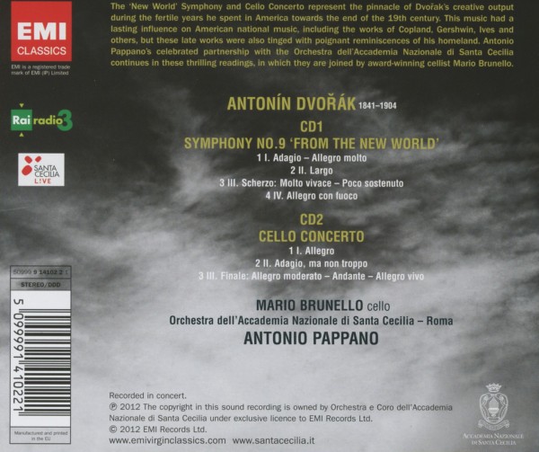 Disc 01 Symphony No. 9 in E Minor "From the New World", Op. 95: I Adagio - Allegro molto 01. Antonio Pappano/Orchestra Stabile Accademia di Santa Cecilia, Roma "1. Adagio - Allegro molto" Symphony No. 9 in E Minor "From the New World", Op. 95: II Largo 02. Antonio Pappano/Orchestra Stabile Accademia di Santa Cecilia, Roma "2. Largo" Symphony No. 9 in E Minor "From the New World", Op. 95: III Scherzo (Molto vivace) 03. Antonio Pappano/Orchestra Stabile Accademia di Santa Cecilia, Roma "3. Scherzo: Molto vivace - Poco" Symphony No. 9 in E Minor "From the New World", Op. 95: IV Allegro con fuoco 04. Antonio Pappano/Orchestra Stabile Accademia di Santa Cecilia, Roma "4. Allegro con fuoco"