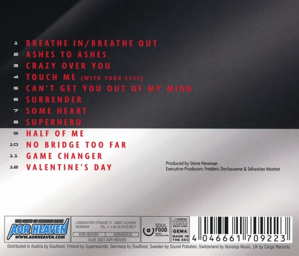 1.1 Breathe in, Breathe Out1.2 Ashes to Ashes1.3 Crazy Over You1.4 Touch Me (With Your Eyes)1.5 Can't Get You Out of My Mind1.6 Surrender1.7 Some Heart1.8 Superhero1.9 Half of Me1.10 No Bridge Too Far1.11 Game Changer1.12 Valentine's Day |