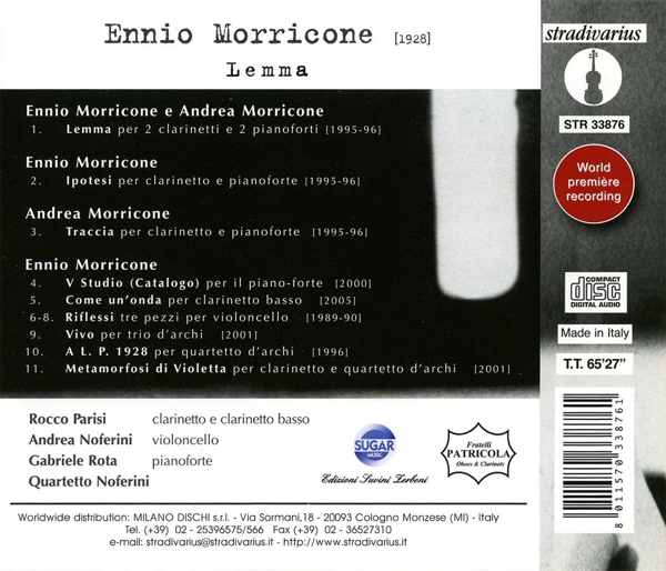 1.1 E. Morricone: Ipotesi for Clarinet ; Piano1.2 V Studio (Catalogo) for the Piano1.3 Come Un Onda for Bass Clarinet1.4 Riflessi Three Pieces for Cello1.5 Vivo for String Trio1.6 A L. P. 1928 for String Quartet1.7 Metamorfosi Di Violetta for Clarinet ; String Quartet1.8 E. Morricone ; a. Morricone: Lemma for Two Clarinets ; Two Pianos1.9 A. Morricone: Traccia for Clarinet ; Piano |