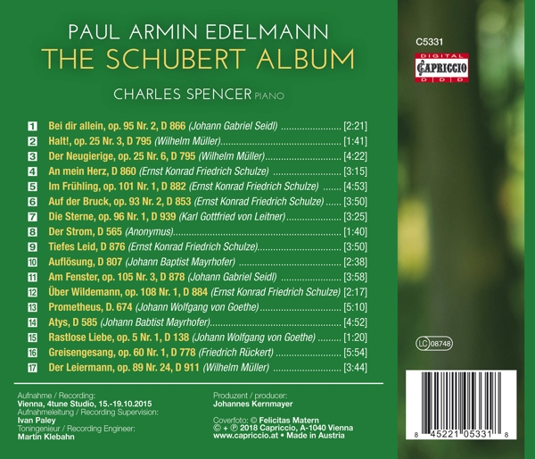 Beschreibung:Baritone Vocals, Liner Notes: Paul Armin Edelmann, Composed By: Franz Schubert, Engineer [Recording]: Martin Klebahn, Liner Notes: Gerhard Persché, Liner Notes [Translation]: Ian Mansfield, Photography By: Felicitas Matern, Photography By: Jan Neubert, Piano: Charles Spencer (2), Producer: Johannes Kernmayer, Recording Supervisor: Iván Paley, Text By: Johann Gabriel Seidl, Text By: Wilhelm Müller, Text By: Wilhelm Müller, Text By: Ernst Konrad Friedrich Schulze, Text By: Ernst Konrad Friedrich Schulze, Text By: Ernst Konrad Friedrich Schulze, Text By: Karl Gottfried von Leitner, Text By: Anonymous, Text By: Ernst Konrad Friedrich Schulze, Text By: Johann Mayrhofer, Text By: Johann Gabriel Seidl, Text By: Ernst Konrad Friedrich Schulze, Text By: Johann Wolfgang von Goethe, Text By: Johann Mayrhofer, Text By: Johann Wolfgang von Goethe, Text By: Friedrich Rückert, Text By: Wilhelm Müller, Labelcode CIO5331.2 (C5331), Copyright (c) Capriccio (2), Phonographic Copyright (p) Capriccio (2), Recorded At 4Tune Studio