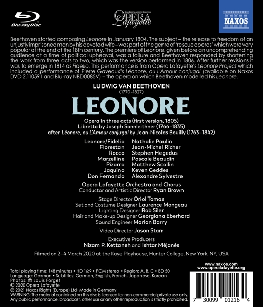 01. (keine Angaben) "Vorspann" Leonore (Oper in 3 Akten) (1. Fassung 1805) (Gesamtaufnahme) 02. Paulin, Nathalie "Ouvertüre" 03. Paulin, Nathalie "Fidelio kommt nicht zurück!" 04. Paulin, Nathalie "O w?r' ich schon mit dir vereint - Wenn ich diese Tür nicht heute schon" 05. Paulin, Nathalie "Jetzt, Sch?tzchen, sind wir allein" 06. Paulin, Nathalie "Ein Mann ist bald genommen - Ist Fidelio noch nicht nach Hause gekommen?" 07. Paulin, Nathalie "Mir ist so wunderbar - H?re, Fidelio" 08. Paulin, Nathalie "Hat man nicht auch Gold beineben - Ihr k?nnt das leicht sagen, Meister Rocco" 09. Paulin, Nathalie "Gut, S?hnchen, gut, hab immer Mut" 10. Paulin, Nathalie "Drei Schildwachen auf den Wall" 11. Paulin, Nathalie "Ha! Welch ein Augenblick! Rocco! - Herr!" 12. Paulin, Nathalie "Jetzt, Alter, jetzt hat es Eile! - Nun ist es endlich entschieden" 13. Paulin, Nathalie "Um in der Ehe froh zu leben - Jetzt ist die Stunde" 14. Paulin, Nathalie "Ach, brich noch nicht, du mattes Herz! - Komm Hoffnung" 15. Paulin, Nathalie "O welche Lust" 16. Paulin, Nathalie "Entfernt euch jetzt!" 17. Paulin, Nathalie "Auf euch nur will ich bauen" 18. Paulin, Nathalie "Gott! Welch Dunkel hier! - In des Lebens Frühlingstagen" 19. Paulin, Nathalie "Wie kalt hier" 20. Paulin, Nathalie "Nur hurtig fort, nur frisch gegraben - Er erwacht!" 21. Paulin, Nathalie "Euch werde Lohn in bessern Welten - Alles ist bereit" 22. Paulin, Nathalie "Er sterbe! - Die Waffe hab ich mir nehmen lassen" 23. Paulin, Nathalie "Ich kann mich noch nicht fassen - Leonore, durch welches Wunder" 24. Paulin, Nathalie "Zur Rache!" 25. Paulin, Nathalie "O Gott! O welch ein Augenblick!" 26. Paulin, Nathalie "Wie lange habt ihr sie getragen?" 27. Paulin, Nathalie "Wer ein holdes Weib errungen" 28. (keine Angaben) "Applaus und Abspann"