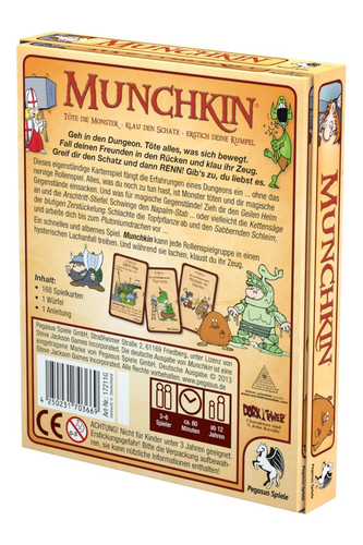 Zusatzbeschreibung: Dieses Kartenspiel fängt die Erfahrungen eines Dungeons ein... ohne das nervige Rollenspiel. Alles, was die Spieler noch zu tun haben, ist Monster töten udn sich magische Gegenstände einsacken. Und was für magische Gegenstände! Sie können den Geilen Helm und die Arschtritt-Stiefel anziehen. Sie können den Napalm-Stab schwingen... oder vielleicht die Kettensäge der blutigen Zerstückelung. Sie schlachten die Topfpflanzen ab und den Sabbernden Schleim und arbeiten sich zum Plutoniumdrachen vor... Schnelles, satirisches Kartenspiel. Für 3-6 Spieler. Ab 12 Jahren. Spieldauer: ca. 60 Minuten.