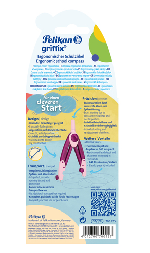 Der neue Pelikan griffix® Schulzirkel. Um den Einstieg in die vielfältige Welt der Geometrie zu erleichtern, haben wir von Pelikan den griffix® Schulzirkel entwickelt. Mit diesem, besonders für Anfänger geeigneten Zirkel, soll der Start im Umgang mit Punkten, Figuren, Symmetrien und Winkelfunktionen ein Kinderspiel werden. Dieser clevere Zirkel hat alles dabei: eine integrierte Anspitzfunktion und ein Ersatzminendepot. Separate Zubehördosen gehören damit der Vergangenheit an. Mit seiner durchdachten Konstruktion und der kompakten Größe passt er in jede Federtasche und ist dank des integrierten Spitzen- und Minenschutzes beim Transport immer sicher geschützt. Durch eine große Feststellschraube ist einfaches und präzises Arbeiten in der Schule kinderleicht. Der griffix® Schulzirkel besitzt ein einzigartiges, geschütztes Design ohne lästige Ecken und Kanten sowie eine attraktive Farbkombination. Die angenehme, rutschfeste Oberfläche macht den griffix® Zirkel zum perfekten Begleiter im Schulalltag.