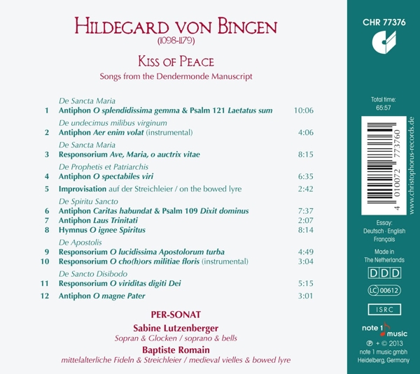 Beschreibung:After the 1000th anniversary of her birth in 1998, not much more was heard about St. Hildegard until Pope Benedict surprisingly entered her in the canon of the Catholic Church last year. This led to renewed interest in both Hildegard's personality and her songs. Sabine Lutzenberger, one of the leading specialists in medieval singing, has been involved with the work of Hildegard for a long time; her first CD of her songs (at that time with the ensemble fur fruhe musik augsburg) was issued by Christophorus in 1990, and another followed in 1997! She returns to the origins for this new CD, interpreting Hildegard's songs directly from a facsimile of the Dendermonde Codex, compiled during Hildegard's lifetime under her supervision. For the interpretation, which concentrates on the beauty of the melodies and pure singing, she has been joined only by Baptiste Romain, who continually brings out important musical features with the medieval fiddle and the bowed lyre. The bells with which Sabine Lutzenberger very discretely accompanies herself are also new. This new recording emanates a deep tranquility, and Sabine Lutzenberger's extensive experience is everywhere in evidence - but it is especially the power inherent in these melodies, almost 1000 years old, that can be sensed in each tone., Runningtime: 00:00:00, Bells, Soprano Vocals: Sabine Lutzenberger, Composed By: Hildegard Von Bingen, Ensemble: Per-Sonat, Executive-Producer, Layout: Joachim Berenbold, Liner Notes: Burkard Wehner, Liner Notes [Translated By]: David Babcock, Liner Notes [Translated By]: Sylvie Coquillat, Photography By: Ellen Schmauss, Photography By: Feiko Koster, Producer, Edited By: Eckhard Glauche, Vielle, Lyre [Bowed]: Baptiste Romain, Labelcode CHS77376.2 (CHR 77376), Recorded At Benediktinerstift Sankt Stephan, Manufactured By Promese, Copyright (c) Note 1 Music GmbH, Phonographic Copyright (p) Note 1 Music GmbH