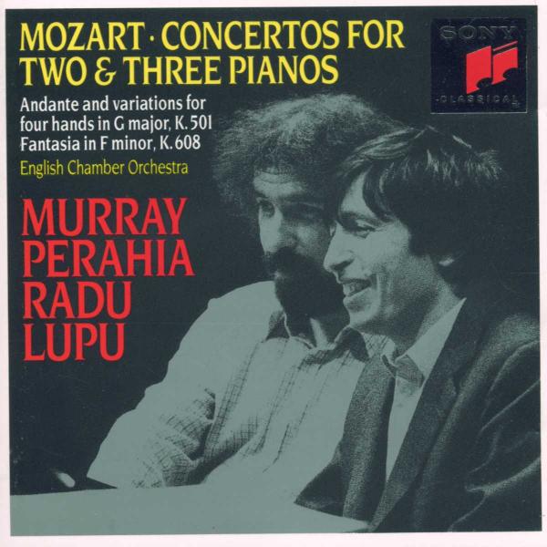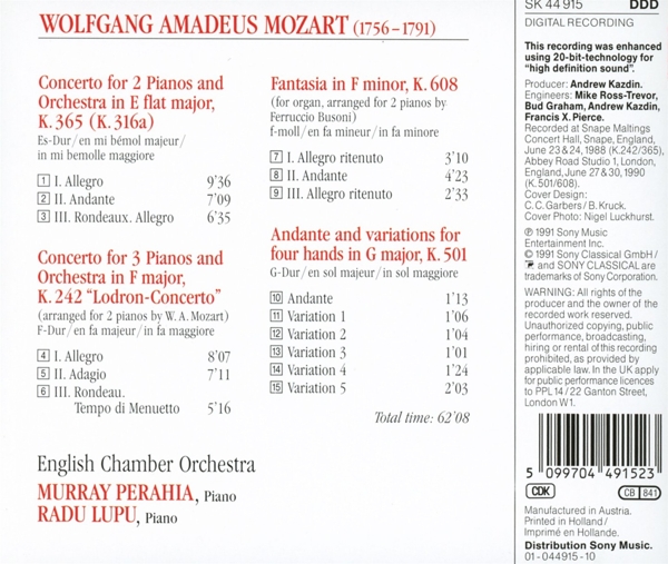 Piano Concerto No. 10 in E-Flat Major, K. 365 / 316a 01. English Chamber Orchestra "I. Allegro" 02. English Chamber Orchestra "II. Andante" 03. English Chamber Orchestra "III. Rondo. Allegro" Piano Concerto No. 7 in F Major, K. 242 'Lodron' (Version for 2 Pianos & Orchestra) 04. Perahia, Murray "I. Allegro" 05. Perahia, Murray "II. Adagio" 06. Perahia, Murray "III. Rondeau. Tempo di minuetto" Fantasy in F Minor, K. 608 (Arr. F. Busoni, M. Perahia & R. Lupu for Piano Duo) 07. Perahia, Murray "I. Allegro ritenuto" 08. Perahia, Murray "II. Andante" 09. Perahia, Murray "III. Allegro ritenuto" 5 Variations in G Major for Piano Duet, K. 501 10. Perahia, Murray "Theme. Andante" 11. Perahia, Murray "Var. 1" 12. Perahia, Murray "Var. 2" 13. Perahia, Murray "Var. 3" 14. Perahia, Murray "Var. 4" 15. Perahia, Murray "Var. 5"