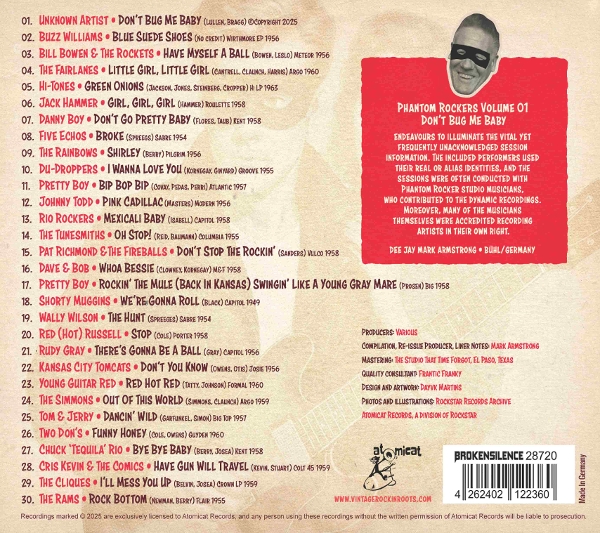 Beschreibung:Brandneue Compilation-Serie auf Atomicat: unter "Phantom Rockers werden Songs zusammengestellt, deren Künstler unerkannt oder unter Pseudonymen an den Aufnahmen beteiligt waren, kurzum eine Schnitzeljagd durch alte Credits und Linernotes von historischen Aufnahmen und Acetaten - CD im wunderschön gestalteten dreiteiligen Digisleeve. Von DJ Mark Armstrong gewohnt professionell zusammengestellt und kommentiert, gibt es hier 30 Rock'n'Roll-Songs zu entdecken, teils "echte Künstler, die von unbek...