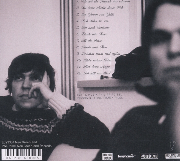 01. Poisel, Philipp "Wie soll ein Mensch das ertragen" 02. Poisel, Philipp "Für keine Kohle dieser Welt" 03. Poisel, Philipp "Im Garten von Gettis" 04. Poisel, Philipp "Froh dabei zu sein" 05. Poisel, Philipp "Bis nach Toulouse" 06. Poisel, Philipp "Zünde alle Feuer" 07. Poisel, Philipp "All die Jahre" 08. Poisel, Philipp "Markt und Fluss" 09. Poisel, Philipp "Zwischen innen und außen" 10. Poisel, Philipp "Liebe meines Lebens" 11. Poisel, Philipp "Hab keine Angst" 12. Poisel, Philipp "Ich will nur (Live)" 13. Poisel, Philipp "Eiserner Steg" 14. Poisel, Philipp / Schweigh?fer, Matthias "Eiserner Steg (Klavier Version)" 15. Poisel, Philipp "Eiserner Steg (Akustik Version)" 16. Poisel, Philipp "Eiserner Steg (Original Version) (Video) (Data Track)" 17. Poisel, Philipp / Schweigh?fer, Matthias "Eiserner Steg (Klavier Version) (Video) (Data Track)"